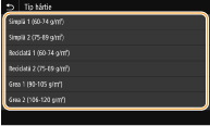 După ce este înregistrată setarea implicită, ecranul pentru setarea hârtiei nu este afişat când încărcaţi hârtie şi este folosită aceeaşi setare mereu. Dacă încărcaţi o altă dimensiune de hârtie fără a modifica setările hârtiei, este posibil ca aparatul să nu imprime corect. Pentru a evita această problemă, selectaţi <Specificare la încărcarea hârtiei> în pasul 3, apoi încărcaţi hârtia.