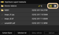 ![]() Când selectaţi <Dată/Oră (Crescător)> sau <Dată/Oră (Descrescător)>, fişierele sunt sortate în funcţie de data şi ora modificării acestora.