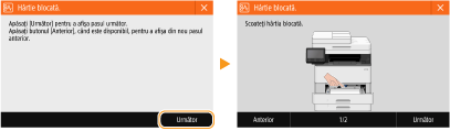 Nu forţaţi scoaterea hârtiei blocate din aparatDacă forţaţi scoaterea hârtiei puteţi deteriora componentele. Dacă nu puteţi scoate hârtia, contactaţi distribuitorul local autorizat Canon sau linia telefonică de asistenţă Canon. Când o problemă nu poate fi rezolvată