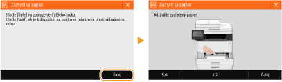V niektorých prípadoch sa pri výskyte chyby zobrazia pokyny, čo máte robiť pri chybe. Problém vyriešite na obrazovke opísaným postupom. Nižšie je ako príklad zobrazená obrazovka, ktoré sa zobrazí pri zaseknutí papiera.