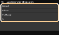 Aktivujte alebo deaktivujte funkciu automatického výberu papiera pre každý zdroj papiera. Ak je funkcia nastavená na možnosť <Zap.>, zariadenie automaticky vyberie zdroj papiera, v ktorom je vložený papiera s vhodnou veľkosťou pre každú tlačovú úlohu. Keď sa minie papier vo vybratom zdroji papiera, táto funkcia umožňuje nepretržitú tlač prepnutím z jedného zdroja papiera na druhý, v ktorom je vložený papier s rovnakou veľkosťou.
