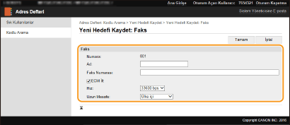 Aynı zamanda, işletim panelindeki <Faks Ayarları> ( <Gönder>) öğesinden [ECM İlt] ve [Hız] belirtebilirsiniz. Ancak Adres Defterine kayıtlı hedeflerin ayrıntılı ayarları için <Adres Defteri> değerinden yapılan ayarlar etkindir.