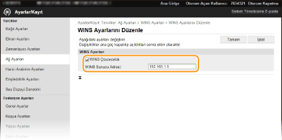 WINS sunucusunun IP adresi bir DHCP sunucusundan alınırsa, alınan IP adresi, [WINS Sunucu Adresi] metin kutusuna girilen IP adresini geçersiz kılar.