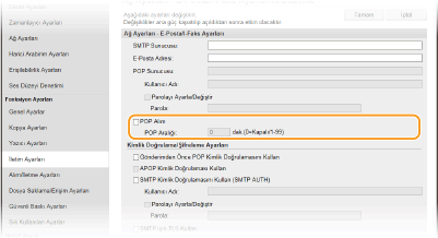 Bu, POP3 sunucusuna otomatik olarak bağlanmak için kullanılan aralığı (dakika olarak) ayarlar. Sunucuda herhangi bir I-Faks belgesi varsa, bunlar otomatik olarak alınır ve yazdırılır.