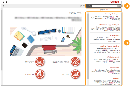 לחץ על  כדי להציג את חלון החיפוש. מכיל תיבת טקסט לביצוע חיפוש לפי מילת מפתח ולאיתור הדף שאתה מחפש.