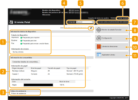 Al iniciar sesión en la IU remota aparece la siguiente página del Portal. En esta sección se describen los elementos que aparecen en la página del Portal y las operaciones básicas.