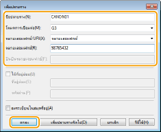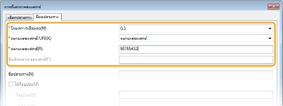 เมื่อใช้งานฟิลด์ [ยืนยันหมายเลขแฟกซ์] หรือ [ยืนยัน URI] ให้ป้อนหมายเลขที่ถูกต้องลงในฟิลด์นั้นด้วย การตั้งค่าว่าจะยืนยันหมายเลขที่ป้อนหรือไม่สามารถเปลี่ยนแปลงได้ในหน้าจอไดรเวอร์แฟกซ์ สำหรับข้อมูลเพิ่มเติม คลิก [วิธีใช้] บนหน้าจอไดรเวอร์แฟกซ์