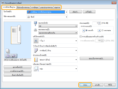 เลือกไดรเวอร์เครื่องพิมพ์ของเครื่องนี้ และคลิก [ค่ากำหนด] หรือ [คุณสมบัติ]