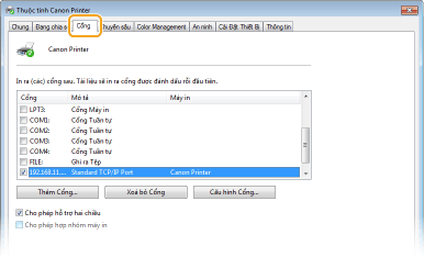 Nếu [Mô tả] của cổng đã chọn là [Cổng MFNP Canon], và máy và máy tính ở cùng mạng con, thì kết nối sẽ được duy trì. Bạn không cần thêm một cổng mới. Nếu là [Cổng TCP/IP tiêu chuẩn], bạn cần thêm cổng mới. Cấu Hình Cổng Máy In