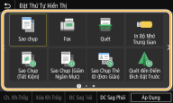 Bạn có thể thêm các nút tắt vào màn hình Home cho các chức năng thường xuyên sử dụng như <Sao chụp>, <Fax>, và <Quét> . Ví dụ, bạn có thể thực hiện các tác vụ nhanh hơn và hiệu quả hơn bằng cách chỉ định một chuỗi các cài đặt (ví dụ như "Quét cả hai mặt của bản gốc, lưu nó dưới dạng tập tin PDF nén chất lượng cao và gửi nó qua e-mail") thành một nút duy nhất.