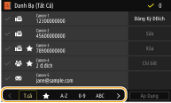 Bạn có thể đăng ký điểm đích fax/quét thường xuyên sử dụng trong Danh Bạ và dễ dàng lựa chọn chúng khi cần (Đăng Ký Điểm Đích trong Danh Bạ). Những điểm đích có thể tìm kiếm theo thứ tự bảng chữ cái, từ danh sách trong Danh Bạ, hoặc bằng cách nhập số có ba chữ số (số quay số mã hóa). Bạn cũng có thể xác định điểm đích nhanh hơn bằng cách sử dụng các tính năng sau đây.