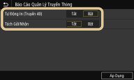Chọn <Bật> để in riêng các báo cáo được gửi và nhận, hoặc <Tắt> để in cả hai báo cáo trên một tờ.