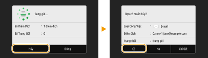 Nếu bạn muốn huỷ bỏ gửi tài liệu ngay sau khi chọn <Bắt Đầu>, chọn <Hủy> trên màn hình hiển thị hoặc nhấn . Bạn cũng có thể huỷ gửi tài liệu sau khi kiểm tra tình trạng gửi.