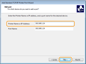 Nếu giao thức in (LPD hoặc RAW) đã được thay đổi ở phía máy (Cấu Hình Giao Thức In và Các Chức Năng WSD) hoặc số cổng được thay đổi (Thay Đổi Số Cổng), các cài đặt tương ứng trên máy tính cũng phải được cấu hình. Thao tác này không cần thiết cho cổng WSD.