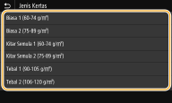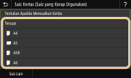 Selepas tetapan kertas lalai didaftarkan, skrin tetapan kertas tidak dipaparkan apabila kertas dimuatkan dan tetapan sama sentiasa digunakan. Jika anda memuatkan saiz dan jenis kertas yang berbeza tanpa mengubah tetapan kertas, mesin mungkin tidak mencetak dengan betul. Untuk mengelak masalah ini, pilih <Tentukan Apabila Memuatkan Kertas> dalam langkah 3 dan kemudian, muatkan kertas.