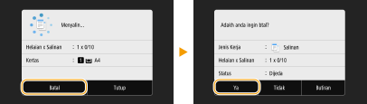 Jika anda ingin membatalkan penyalinan serta-merta selepas memilih <Mula>, pilih <Batal> pada skrin atau tekan