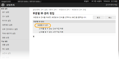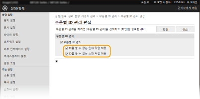 컴퓨터에서의 작업에 대해 부서 ID 관리 설정). 그러나 이 설정의 확인란을 선택하면 ID와 PIN을 입력하지 않더라도 작업이 실행됩니다. 올바른 ID와 PIN을 입력하지 않으면 작업이 실행되지 않도록 설정을 구성하려면 확인란의 선택을 해제합니다.