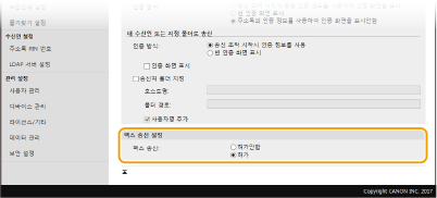 인증된 이메일 주소를 가진 사용자 이외의 이메일 및 I-팩스 전송을 차단합니다. 인증된 사용자의 이메일 주소를 LDAP 서버에 등록해야 합니다.
