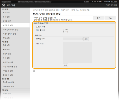 MAC 주소를 잘못 입력하면 리모트 UI에서 기기에 액세스하지 못할 수도 있으며 이러한 경우 <MAC 주소 필터>를 <해제>로 설정해야 합니다. <MAC 주소 필터>