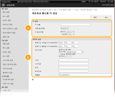 TLS(Transport Layer Security)를 통한 암호화된 통신에 필요한 경우 기기에서 키 및 인증서를 생성할 수 있습니다. 리모트 UI를 통해 기기에 액세스할 때 TLS를 사용할 수 있습니다. 자가 서명 인증서가 "네트워크 통신"에서 생성된 키 및 인증서에 사용됩니다.