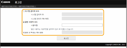 모든 리모트 UI 작업과 설정을 수행할 수 있습니다. [시스템 관리자 ID]에 해당 ID를 입력하고 [시스템 관리자 PIN 번호]에 PIN을 입력합니다.