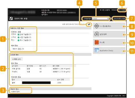리모트 UI에 로그인하면 다음의 포털 페이지가 나타납니다. 이 단원에서는 포털 페이지에 표시되는 항목과 기본 조작에 대해 설명합니다.