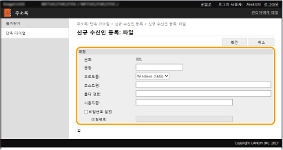 컴퓨터를 사용하여 기기의 주소록에 수신인을 등록하거나 등록된 수신인의 정보를 편집할 수 있습니다. 공유 폴더 또는 FTP 서버 주소를 여기에서 지정합니다.