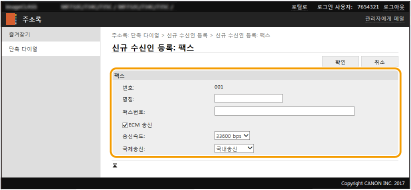 조작 패널의 <팩스 설정>( <송신>)에서 [ECM 송신] 및 [송신속도]를 지정할 수도 있습니다. 그러나 주소록에 등록된 수신인의 세부 설정의 경우 <주소록>에서 지정한 설정이 활성화됩니다.