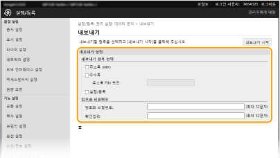 주소록과 기기의 설정 데이터를 컴퓨터에 저장할 수 있습니다(내보내기). 컴퓨터에 저장된 데이터를 기기에 등록할 수도 있습니다(가져오기). 주소록의 수신인을 여러 기기로 쉽게 복사할 수 있습니다.* 이러한 기능을 사용하려면 시스템 관리자 모드로 로그인해야 합니다.