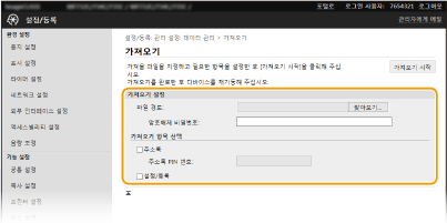 기기의 조작 패널을 사용하여 USB 메모리 장치를 통해 설정 데이터를 가져오기/내보내기할 수 있습니다. <가져오기/내보내기>
