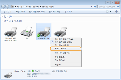 기기의 프린터 드라이버 아이콘을 마우스 오른쪽 버튼으로 클릭하고 [프린터 속성] 또는 [속성]을 클릭합니다.