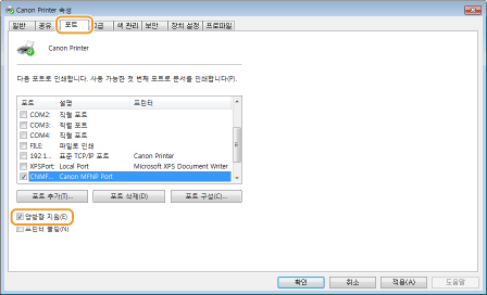 선택한 포트의 [설명]이 [Canon MFNP Port]이고 기기와 컴퓨터가 동일한 서브넷에 있는 경우 연결이 유지됩니다. 새 포트를 추가할 필요가 없습니다. [표준 TCP/IP 포트]인 경우 새 포트를 추가해야 합니다. 프린터 포트 구성