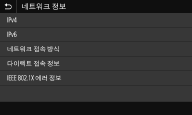 기기의 IP 주소 등의 네트워크 설정 및 무선 LAN 통신 상태 등의 상태를 표시합니다.