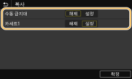 적어도 하나의 용지 카세트에 항상 <설정>을 지정하십시오. 모든 용지 카세트에 <해제>를 선택하면 설정 절차를 끝낼 수 없습니다.