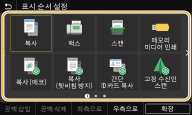 <복사>, <팩스> 및 <스캔> 등과 같이 자주 사용되는 기능에 대해서 홈 화면에 단축 버튼을 추가할 수 있습니다. 예를 들면, 하나의 버튼에 일련의 설정("원고의 양면을 스캔해서 고압축 PDF로 저장해서 이메일을 통해 송신"하는 등의 설정)을 할당함으로써 작업을 더욱 신속하고 효율적으로 실행할 수 있습니다.