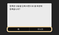 <예>를 선택하면 메시지가 표시됩니다. 메시지를 확인한 후, <확인>를 선택합니다. 등록된 설정 조합이 단축 버튼으로 홈 화면에 추가됩니다.