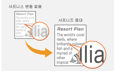 이미지의 선명도를 조절할 수 있습니다. 선명도를 높여 흐릿한 텍스트와 선을 선명하게 하거나 선명도를 낮춰 잡지 사진의 모양을 개선합니다. 선명도 조정