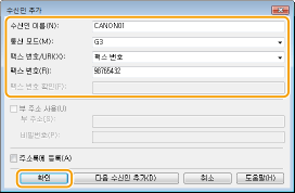 통신 모드와 팩스 번호(또는 URI)를 설정하고 [확인]을 클릭합니다.