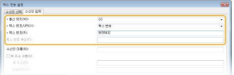 통신 모드와 팩스 번호(또는 URI)를 설정합니다.