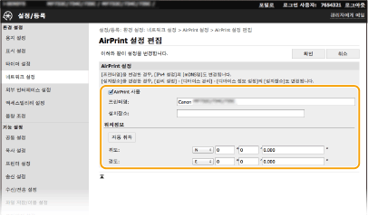 [AirPrint 사용]를 선택한 경우, <네트워크>의 다음 설정이 <설정>으로 설정됩니다.HTTP 사용