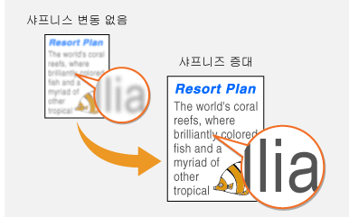 이미지의 선명도를 조절할 수 있습니다. 선명도를 높여 흐릿한 텍스트와 선을 선명하게 하거나 선명도를 낮춰 잡지 사진의 모양을 개선합니다.