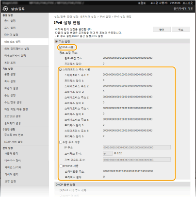 리모트 UI를 통해 기기의 IPv6 주소를 구성할 수 있습니다. IPv6 주소를 설정하기 전에 IPv4 주소 설정을 확인하십시오(IPv4 설정 표시). IPv6 주소를 사용하려면 정확한 IPv4 주소를 설정해야 합니다. 스캐너 드라이버 또는 MF Scan Utility를 사용하는 스캔 기능은 IPv6 환경에서 사용할 수 없다는 점에 유의하십시오. 본 기기는 다음과 같은 다수의 IPv6 주소를 사용할 수 있습니다.