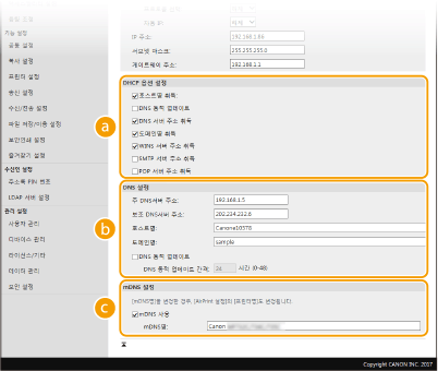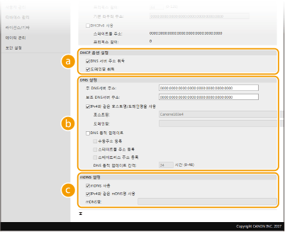 기기의 IP 주소가 변경될 때마다 DNS 레코드를 동적으로 업데이트하려면 확인란을 선택합니다. 업데이트 간격을 지정하려면 [DNS 동적 업데이트 간격] 텍스트 상자에 시 단위로 시간을 입력합니다. [mDNS 설정][mDNS 사용]