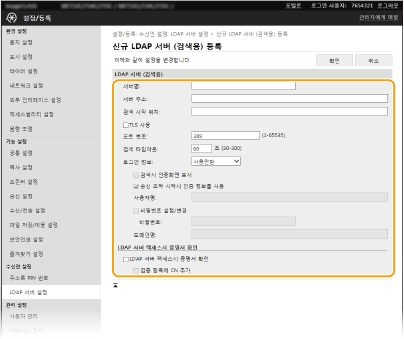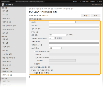 [LDAP 서버 (검색용)] 또는 [LDAP 서버 (인증용)]에 대해 [신규 서버 등록]을 클릭합니다.