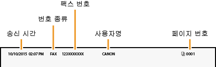 기기의 팩스 번호와 사용자명을 등록합니다. 이 정보는 기기에서 발송되는 각 페이지 맨 위에 인쇄됩니다.