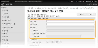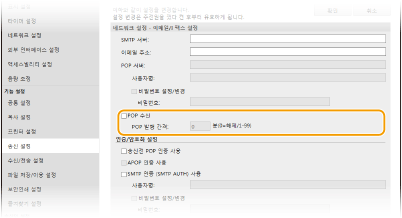 리모트 UI를 사용해서 I-팩스 송수신에 기기를 사용하기 위한 설정 및 이메일 또는 I-팩스를 송신하기 전에 POP 인증 및 통신 암호화를 위한 설정 등과 같은 상세한 송수신 설정을 합니다. 필요한 설정에 관해서는 프로바이더 또는 네트워크 관리자에게 문의하십시오.