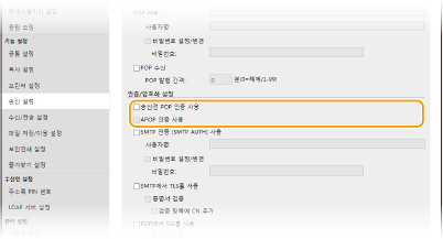 이메일 또는 I-팩스 송신 전에 인증을 위해 POP3 서버를 사용하려면 확인란을 선택합니다.