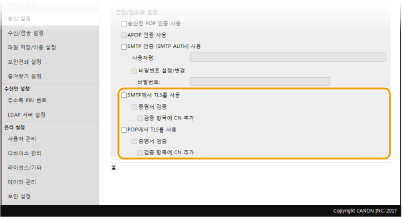 SMTP 서버와의 통신을 암호화하기 위해 TLS를 사용하려면 확인란을 선택합니다. 필요에 따라 [증명서 검증] 또는 [CN을 검증 항목에 추가] 확인란을 선택합니다.