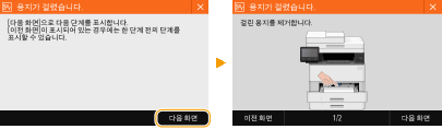 걸린 용지를 제거할 때 기기를 끄지 마십시오기기를 끄면 인쇄 중인 데이터가 삭제됩니다. 팩스 문서를 수신할 때 특히 주의하십시오.