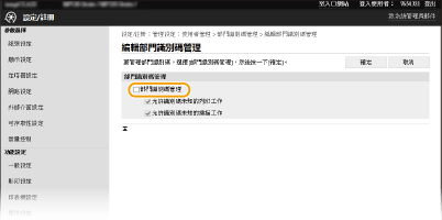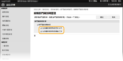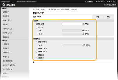 可以針對要註冊的部門限制可列印頁數和可用功能。若要限制列印可列印頁數,請勾選目標類型的核取方塊,然後在 [頁數] 中輸入適當頁數。勾選目標功能的核取方塊可限制功能。 ![]() 如果勾選 [限制掃描] 核取方塊,儲存到 USB 記憶裝置、傳送電子郵件及儲存到共用資料夾或 FTP 伺服器功能全都會受到限制。您也可以限制透過將文件匯入電腦掃描文件的其他方法,但在這種情況下,無法封鎖每個部門識別碼的存取(部門識別碼未知時阻擋工作)。